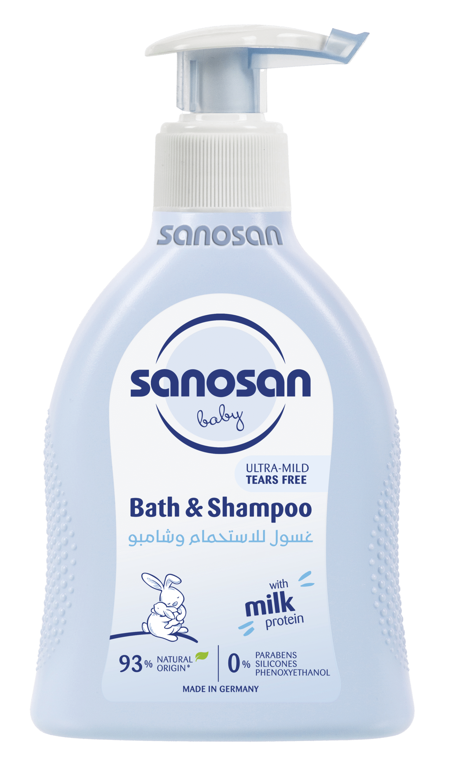 Milk protein ensures that even washing your baby is more gentle.  All cleansing products contain active washing substances. But even the mildest washing substances can attack the protective film on a baby’s skin and upset its balance. The milk protein in sanosan protects against this.