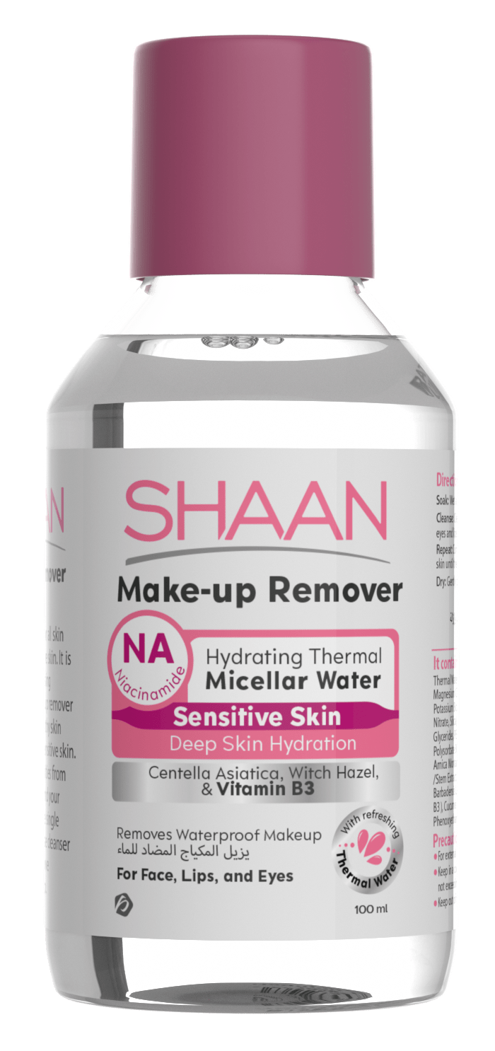 SHAAN Hydrating Therma Micellar Water removes makeup and hydrates the Face without irritating the eyes or sensitive skin. Enriched with Thermal water, Witch Hazel, Aloe vera extract, Centella extract, Niacinamide, Panthenol & Arnica Extract.