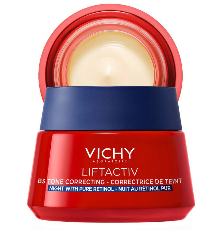 During the day, discoloration and uneven skin tone can be accelerated by exposome aggressions (UV, pollution). Night is the ideal moment to renew the look of discolored skin. The new B3 Tone Correcting Cream, Night with Pure Retinol, has two powerful derm ingredients in a comforting night cream. Powered by 4% niacinamide (Vitamin B3) and 0.15% Pure Retinol, the skin feels renewed, and the skin tone looks more even. Skin looks more radiant and tone is more even.